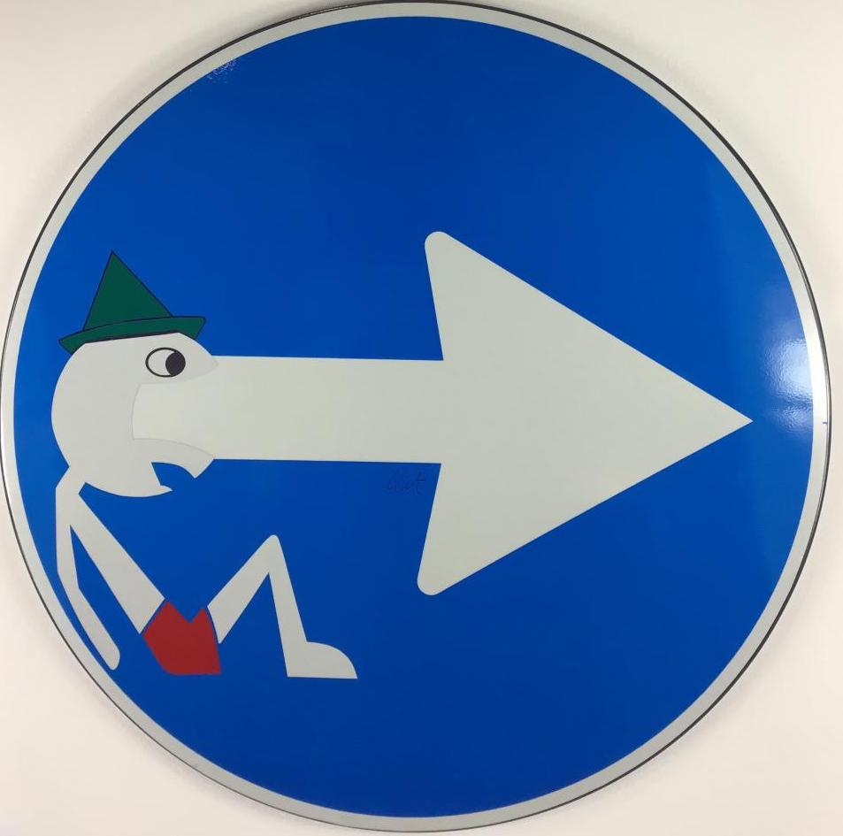 Clet Abraham (1966-) est un artiste peintre, graffeur, sculpteur et spécialiste du détournement de mobilier urbain. Sa technique consiste à apposer des stickers sur les panneaux de signalisation. Ces derniers prennent alors un nouveau sens. Partout où il passe, l'artiste colle des figures noires qui ajoutent un supplément d'âme à ces panneaux. Il travaille dans l'illégalité et les services de voirie éliminent une grande partie de ses productions. A Paris, l'artiste a réalisé plus de 1500 œuvres dont la moitié a disparu. Pourtant, Clet Abraham ne se décourage pas et continue d'apposer sa poésie urbaine partout où il passe.