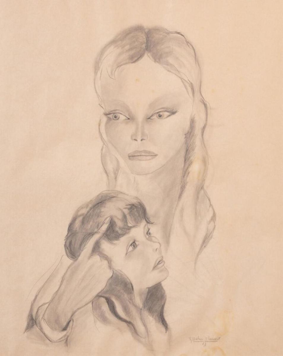 Alors que le créateur s'applique généralement à dessiner des tenues de mode, ce double portrait de mère à l'enfant donne à voir une forte stylisation des formes.