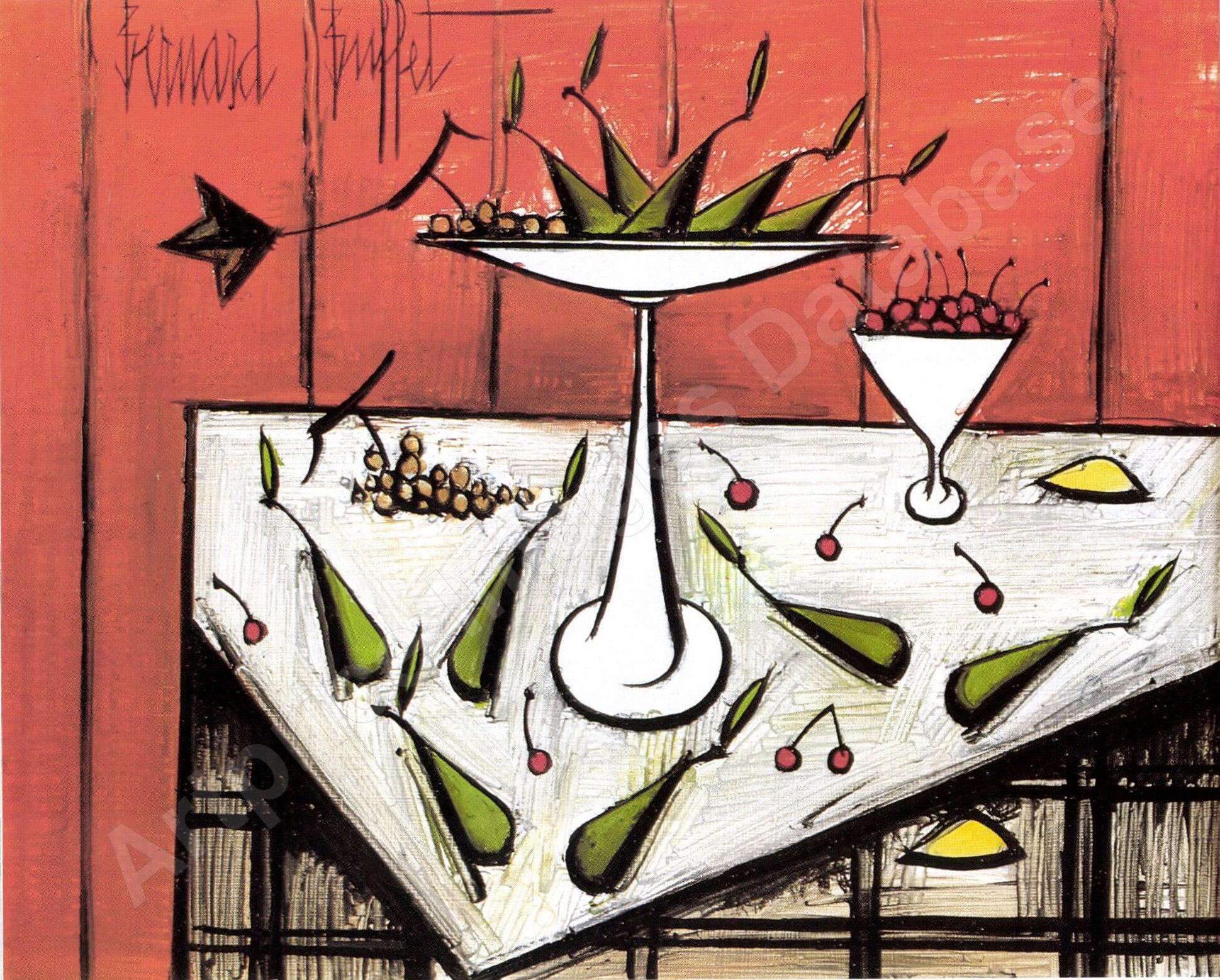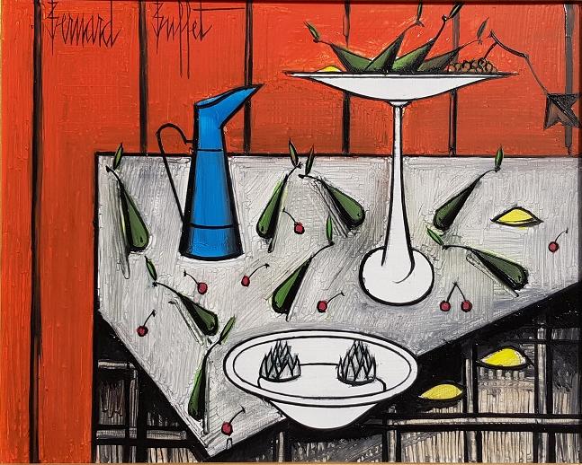 Très similaire à notre Nature morte au broc bleu, et vendue 97 000 euros marteau chez Sotheby's Londres en 1990, Bernard Buffet peint la Nature morte au compotier en 1983, soit un an avant l'œuvre que nous présentons.