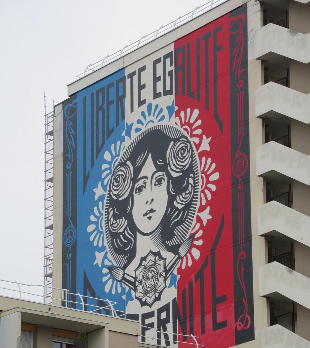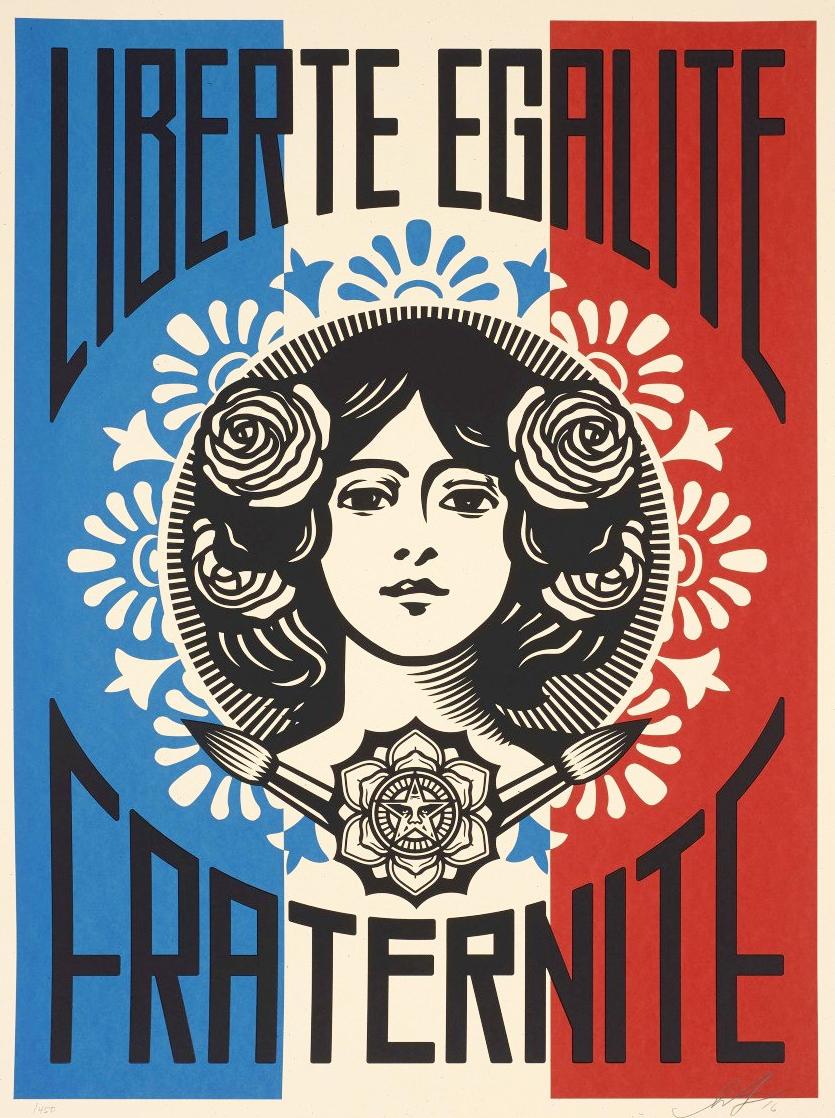 En 2015, Shepard Fairey réalise une importante fresque murale visible dans le 13e arrondissement de Paris. Liberté, Égalité, Fraternité reprend le visage féminin de l'une de ses précédentes œuvres. Elle représente une Marianne devant un drapeau tricolore. Il a remplacé le slogan Make Art not War par la devise de la République. Cette œuvre témoigne du soutien de l'artiste à la France après les attentats du 13 novembre 2015. Elle revêt une importance significative pour lui en tant que symbole d'unité durant cette période sombre et tragique.